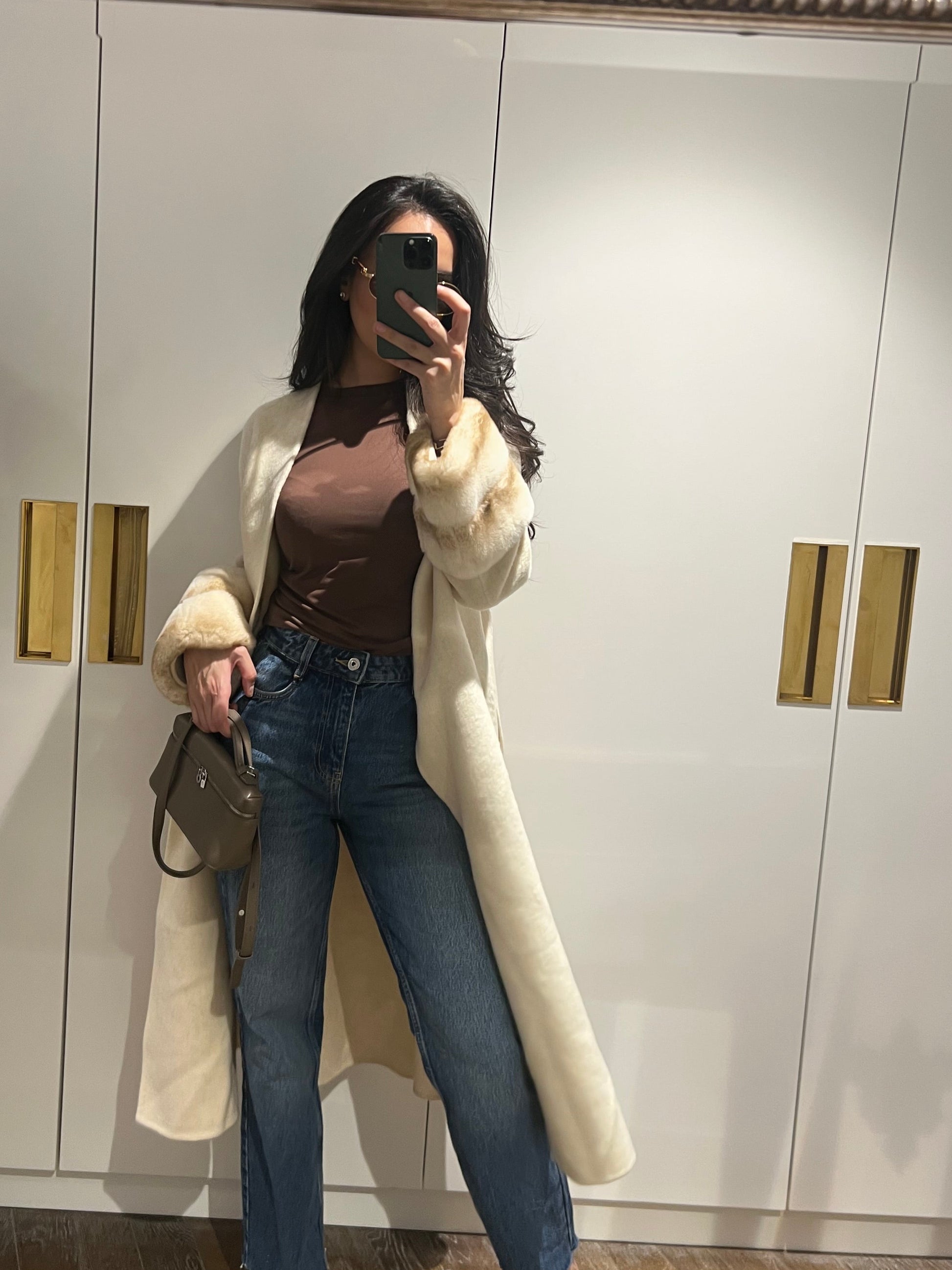 Effortlessly chic, the Celine Coat is a collarless cocoon-style wool coat with luxe two-tone cream rex rabbit cuffs. It features a belted waist and discreet button closure for a polished, versatile look. Soft, elegant, and timeless—perfect for elevating any outfit.