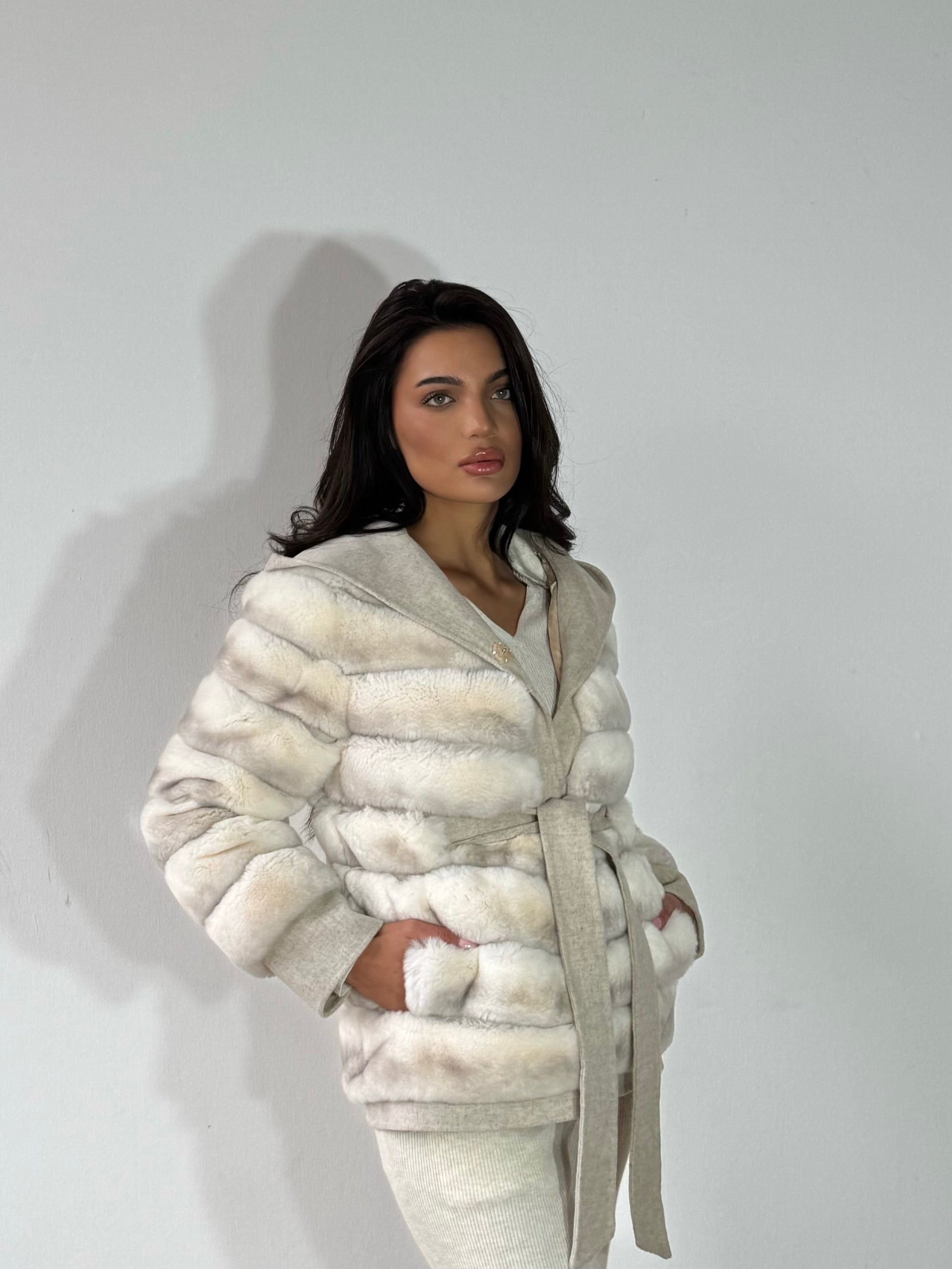 Meet the Cindy Coat, where high-quality luxury meets everyday effortless style. Crafted entirely from soft cream Rex Rabbit, with a 100% cream wool lining, this coat feels as indulgent as it looks. Its puffer-style sleeves and belted waist give a relaxed yet flattering silhouette, while the cream wool hood adds both warmth and casual sophistication.
