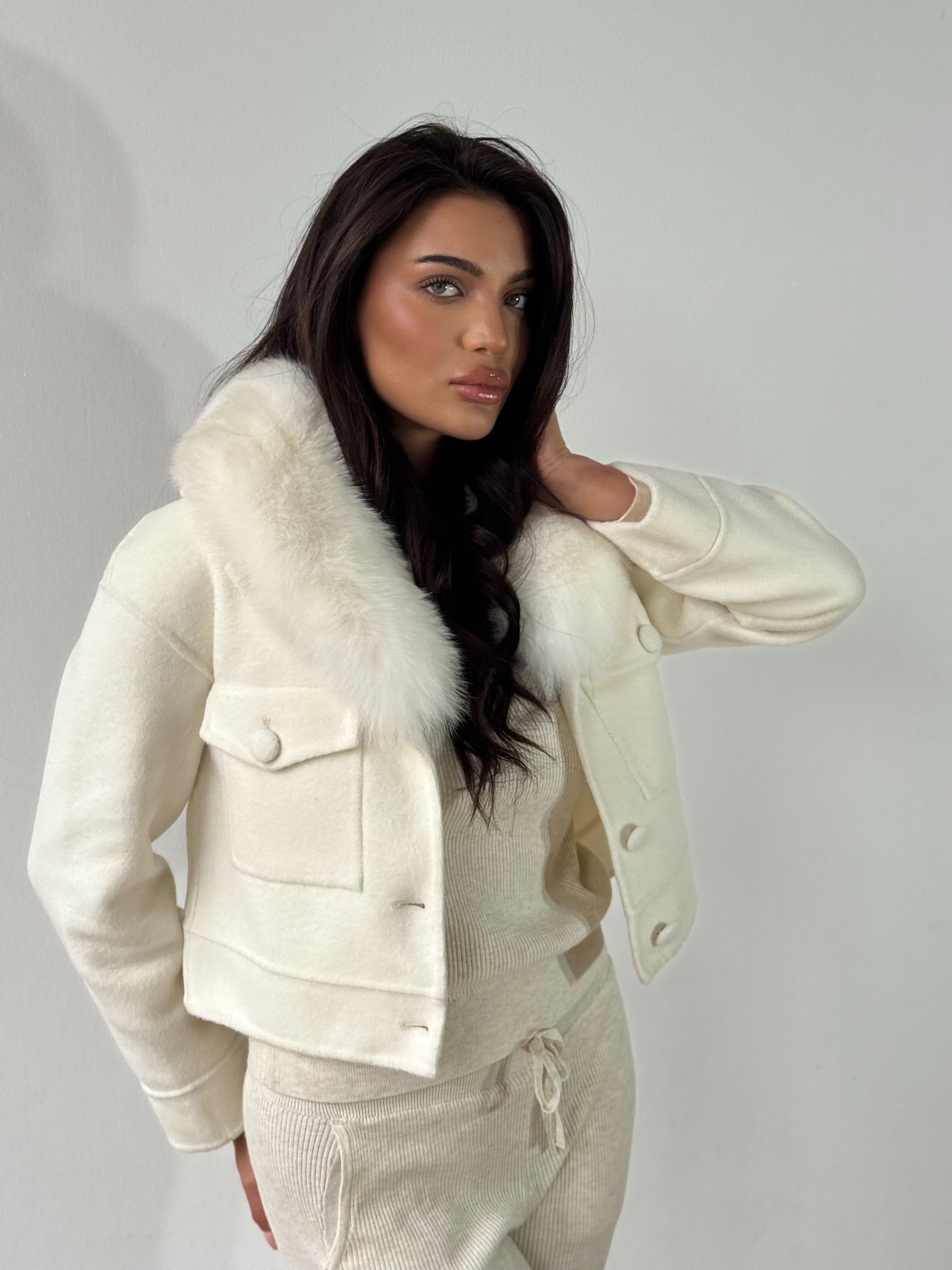 Introducing Josie - White, the short Josie jacket perfect for colder weather. Made from a luxurious blend of 10% cashmere and 90% wool, it offers both warmth and sophistication. The 100% fox fur adds a touch of elegance to any outfit. Stay cozy and stylish with Josie.