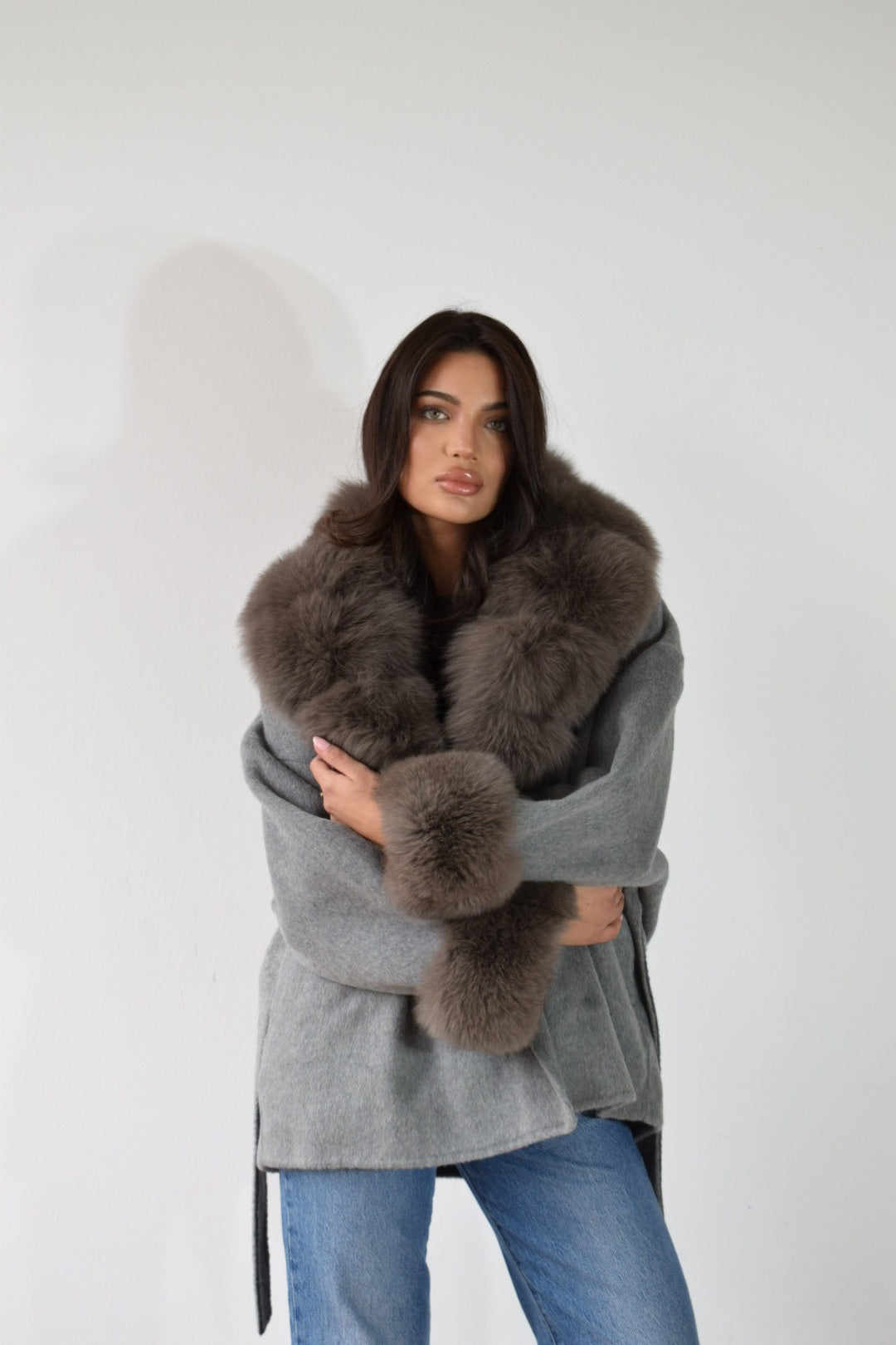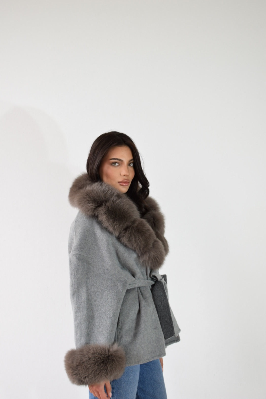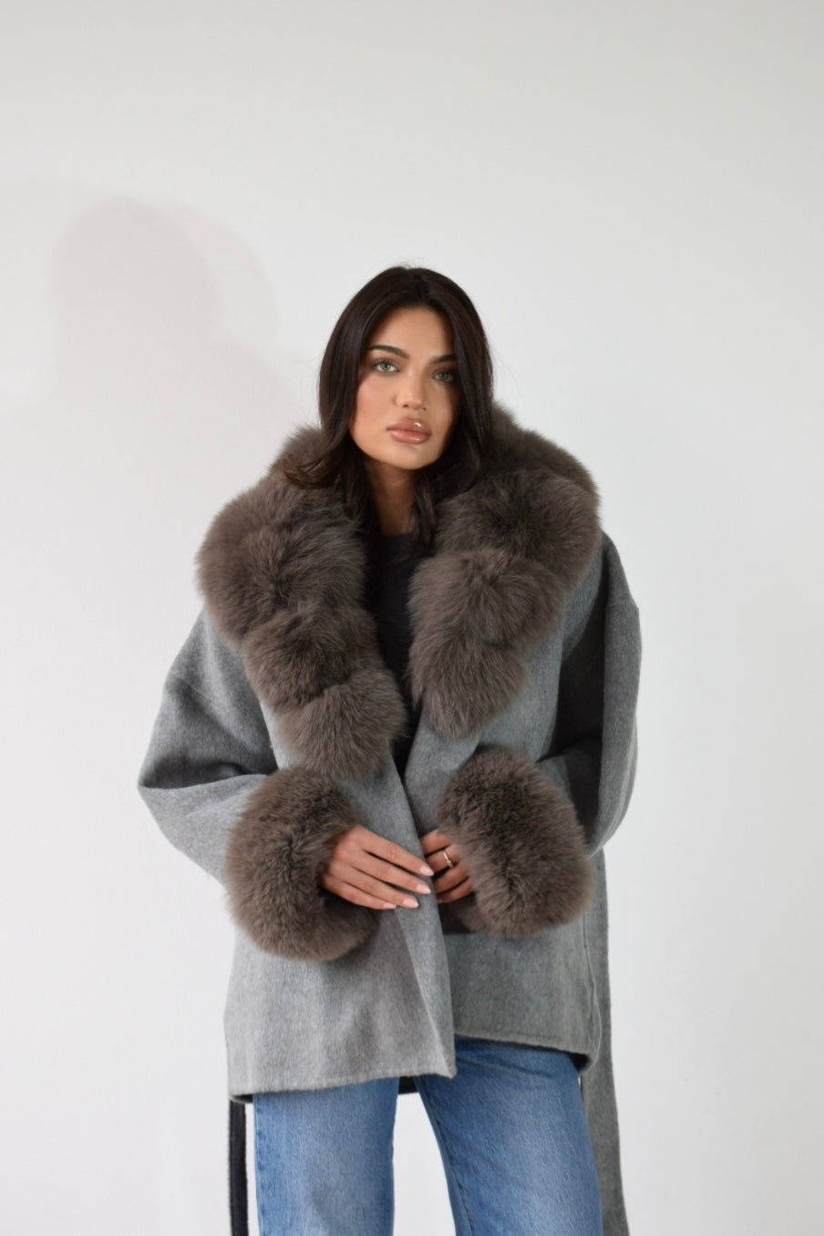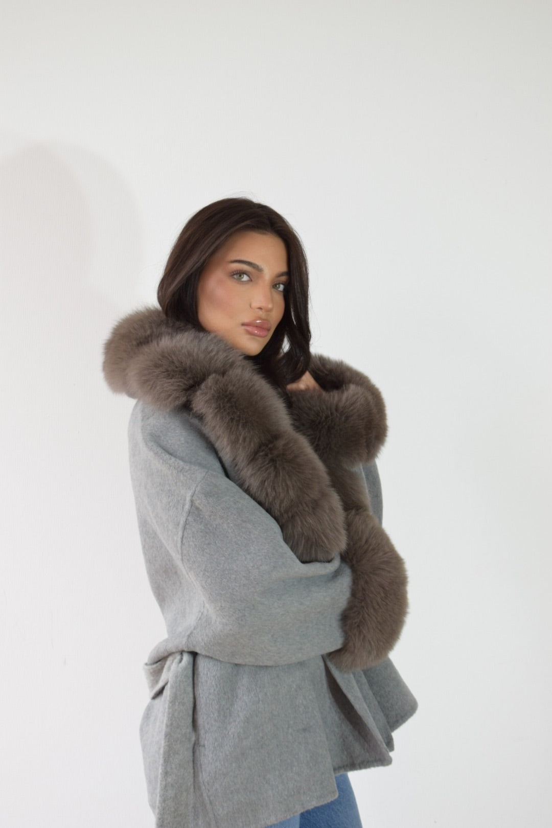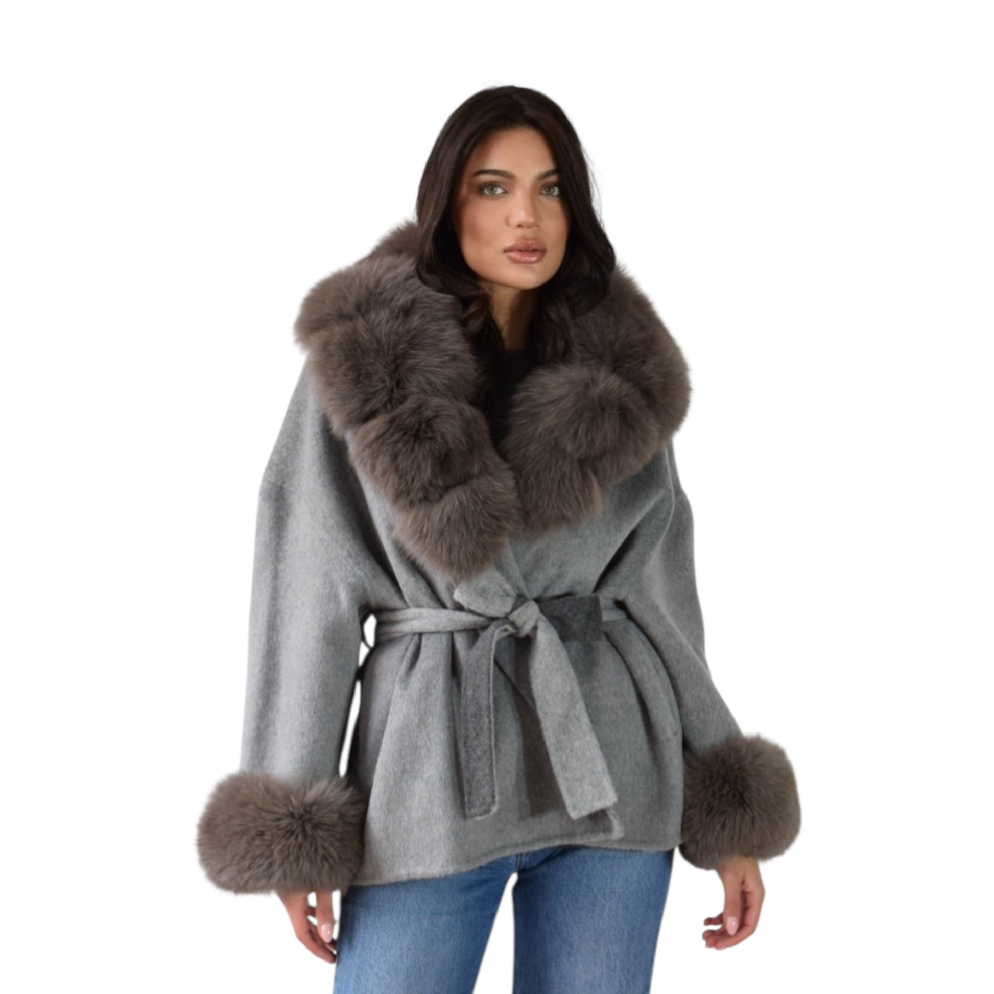 The Lana jacket is a luxurious short coat crafted from 100% premium wool in a sophisticated two-tone grey design. It features rich brown fox fur on the collar, neckline, and cuffs, adding warmth, texture, and an elevated finish. A matching belt cinches the waist for a flattering, tailored silhouette.