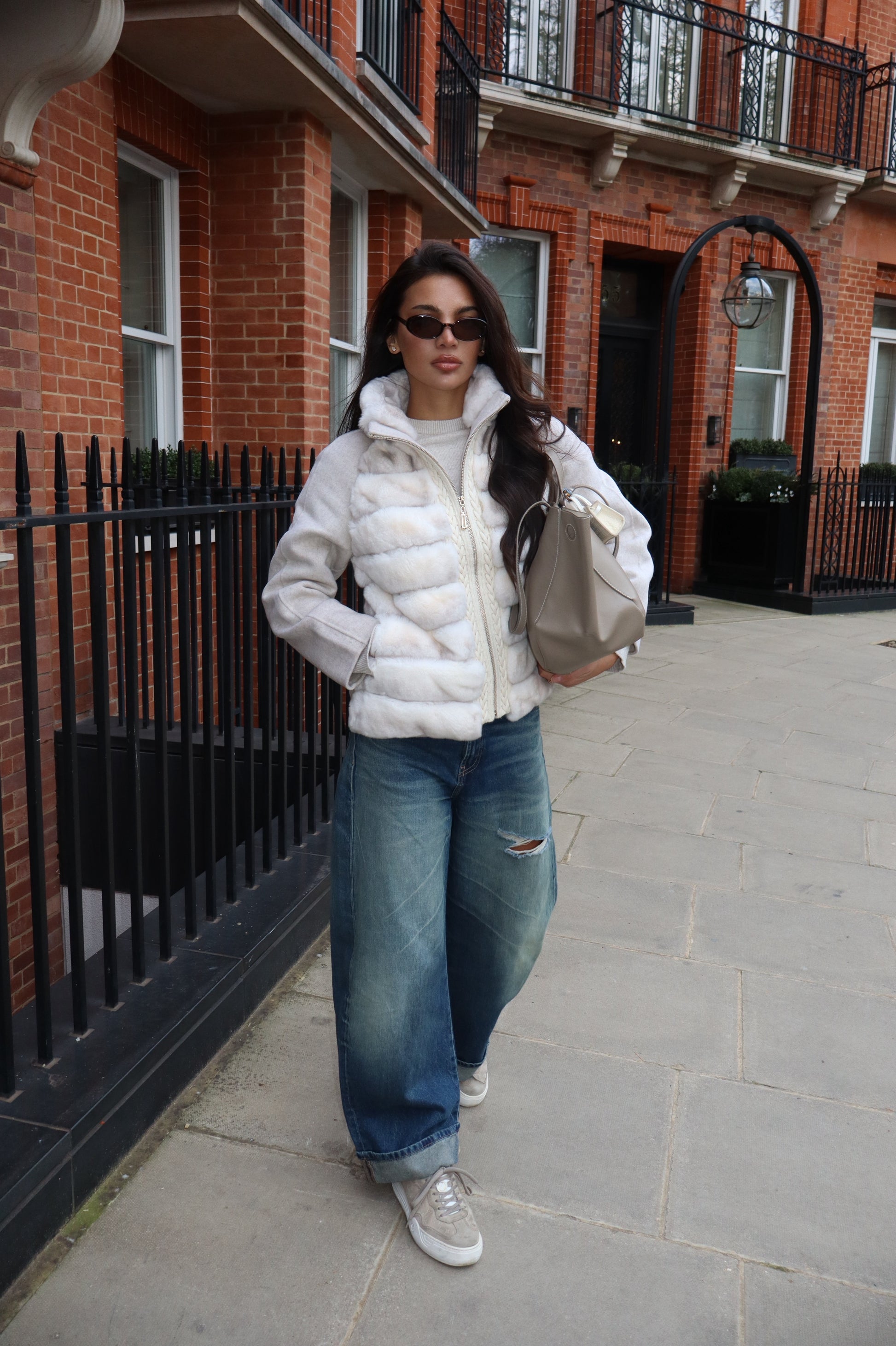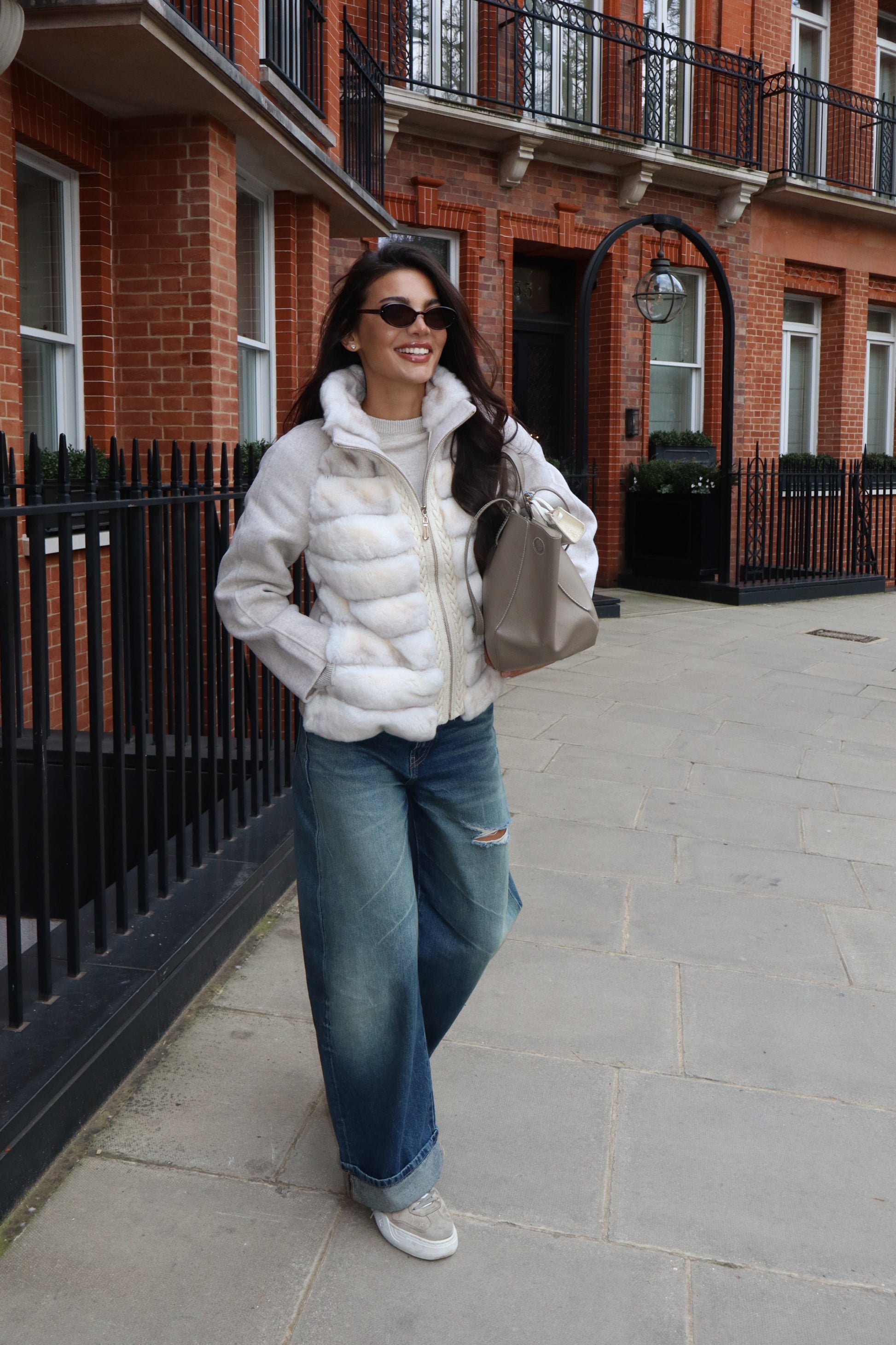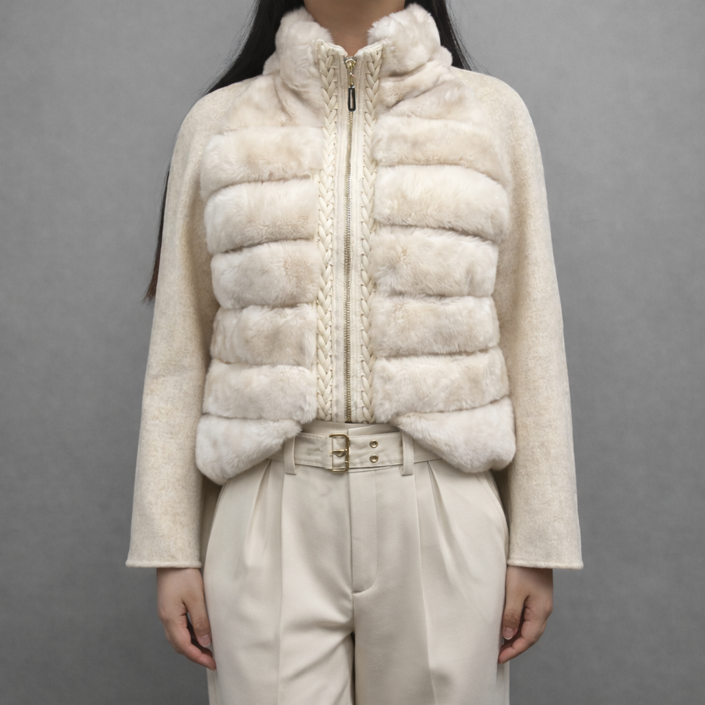The Loro is a modern, elegant jacket featuring a soft fur front made from 100% Rex Rabbit with wool sleeves and a wool back. Its warm cream color and simple design make it perfect for effortless everyday style.